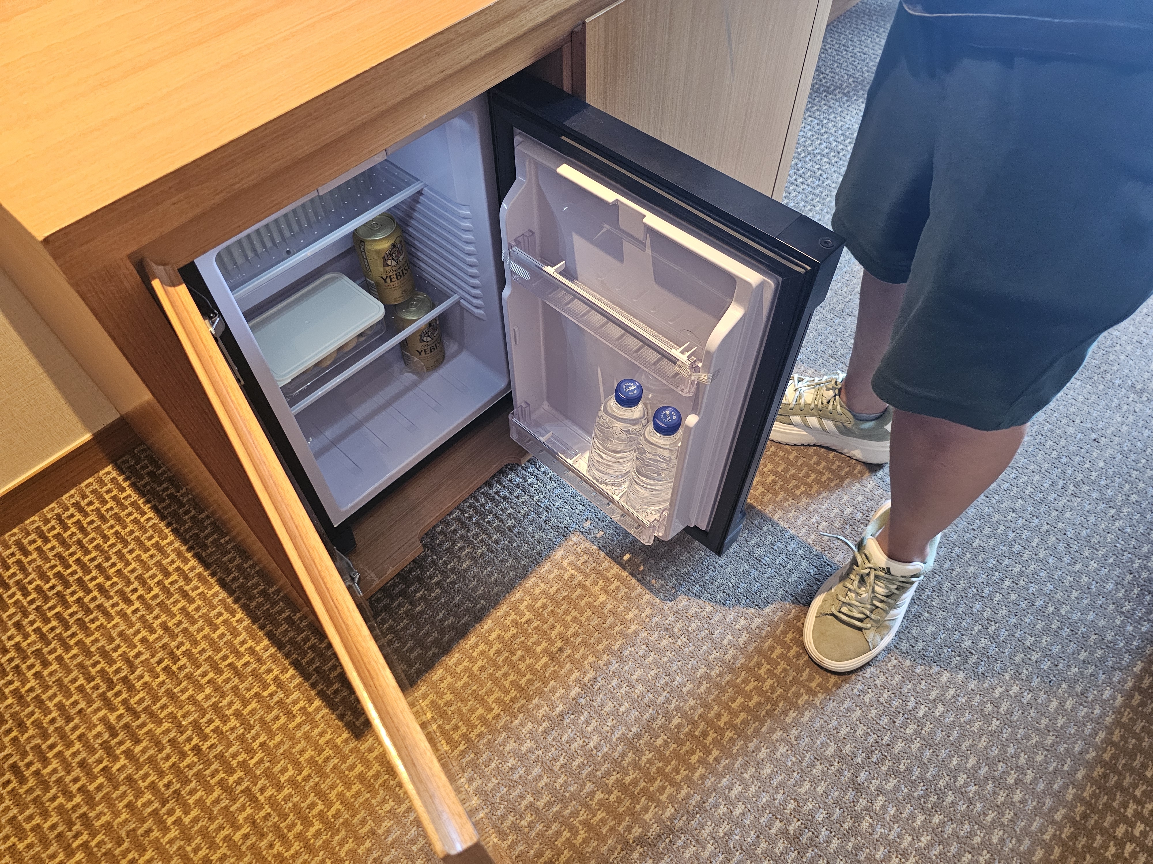 숙소에 가보니 냉장고 안에 물 2개가 있었어요. 1박 당 물 2개씩 제공한다고 합니다. 집에서 가져온 언니의 간식거리를 후다닥 냉장고 안에 보관했습니다.