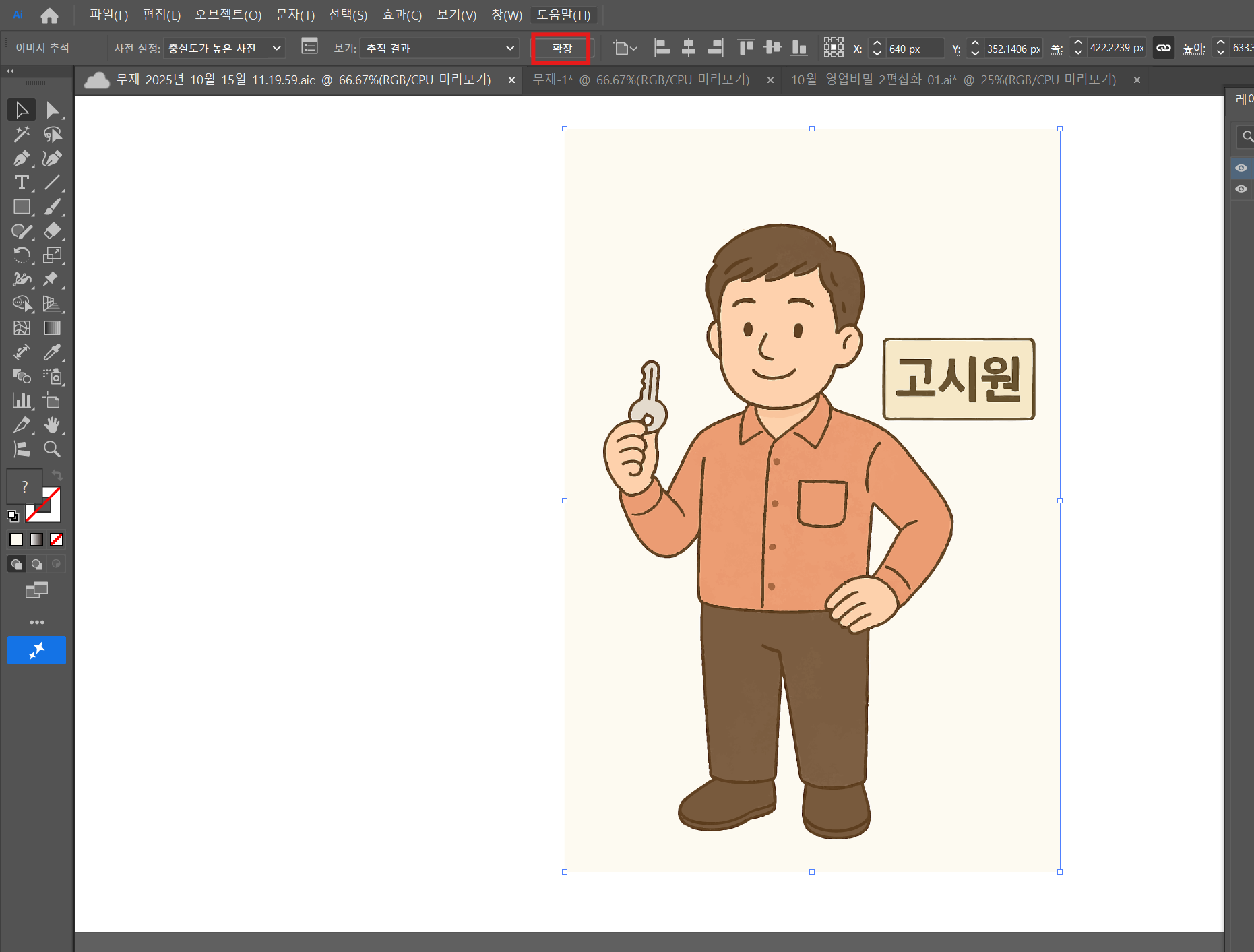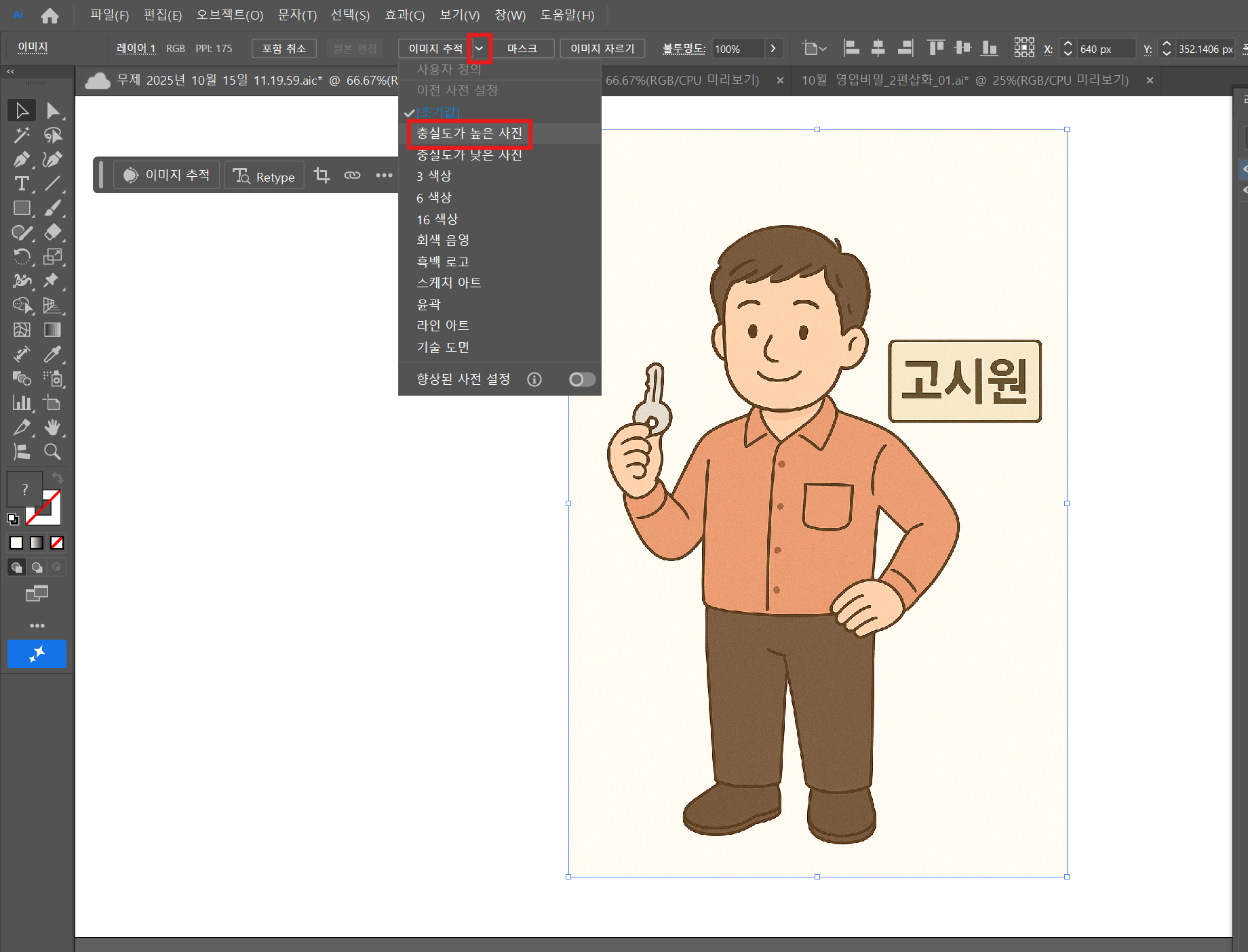 일러스트레이터는 벡터 기반 이미지 편집 프로그램이기 때문에, 그림을 캡쳐해서 붙여놓으면 패스로 전환시켜줘야합니다. 가장 간편하게 변환할 수 있는 것은 상단에 있는 이미지추적인데요. 검은색 마우스로 이미지를 선택해주면 보실 수 있으며, 이미지추척 > 충실도가 높은 사진을 선택해줍니다.