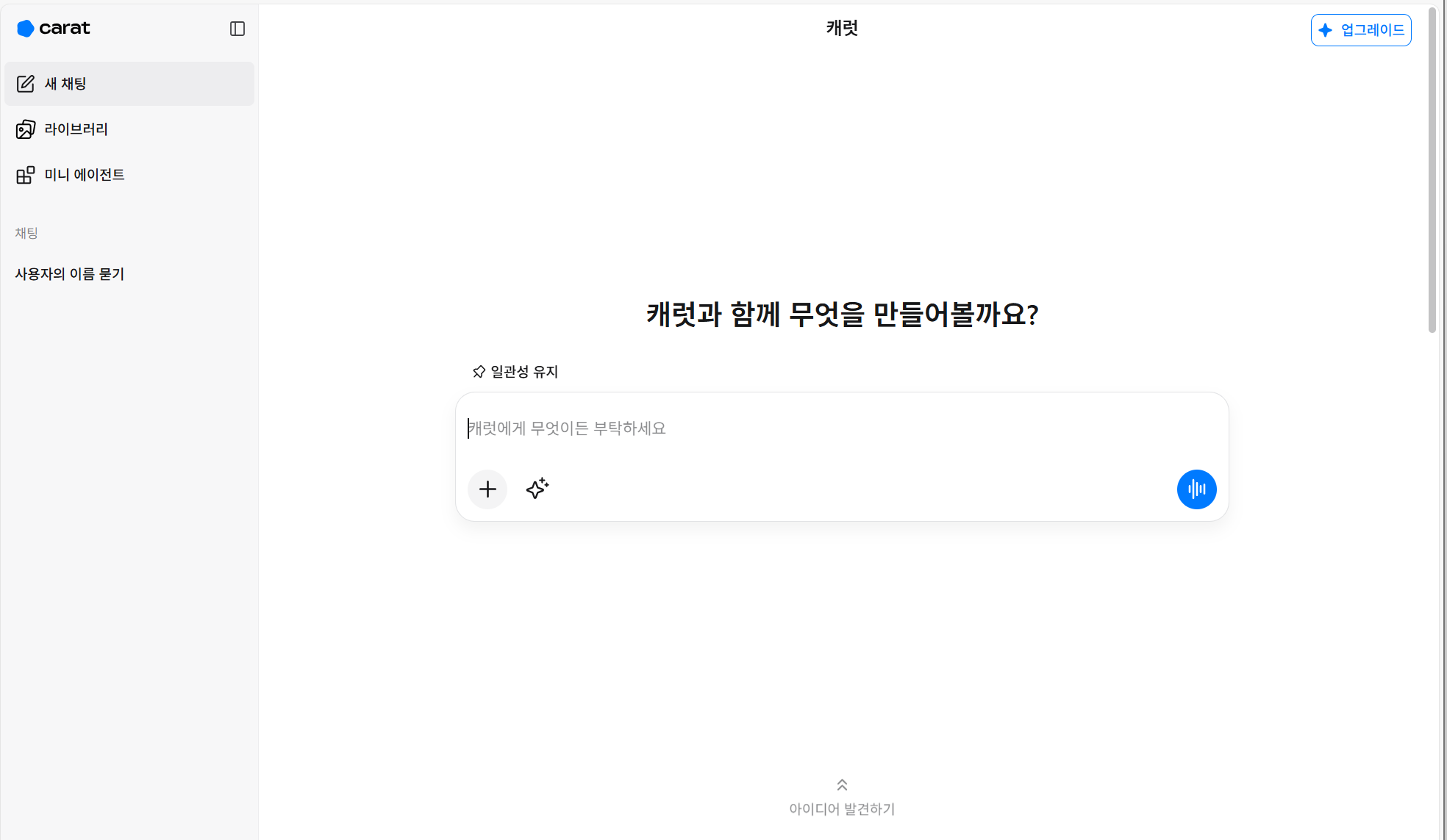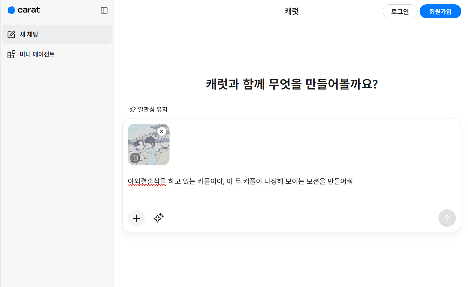 캐럿은 AI 대화만으로 이미지, 영상, 음악 등 다양한 콘텐츠를 제작할 수 있는 AI 에이전트 서비스예요. 원하는 내용을 말하면 AI가 기획부터 디자인까지 전 과정을 수행하며 결과물을 만들어 주는데요.