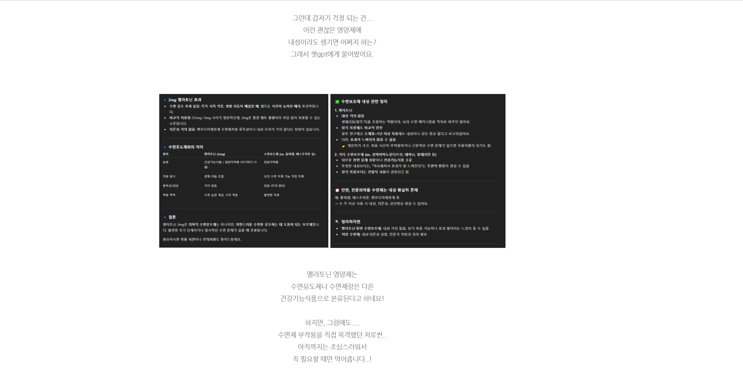 수면보조제로 핫하게 떴던 멜라토닌을 처음 구매하면서, 어떤 성분이고, 내성은 없는지 걱정이 됐었습니다. 그래서 챗GPT에게 멜라토닌 내성에 대해 물어보았었는데요. 멜라토닌을 구매하면서 어떤 성분인지에 대해 공부한 내용들을 직접 기재하고, 챗GPT에게 물어본 내용들도 함께 포스팅에 넣어보았습니다.