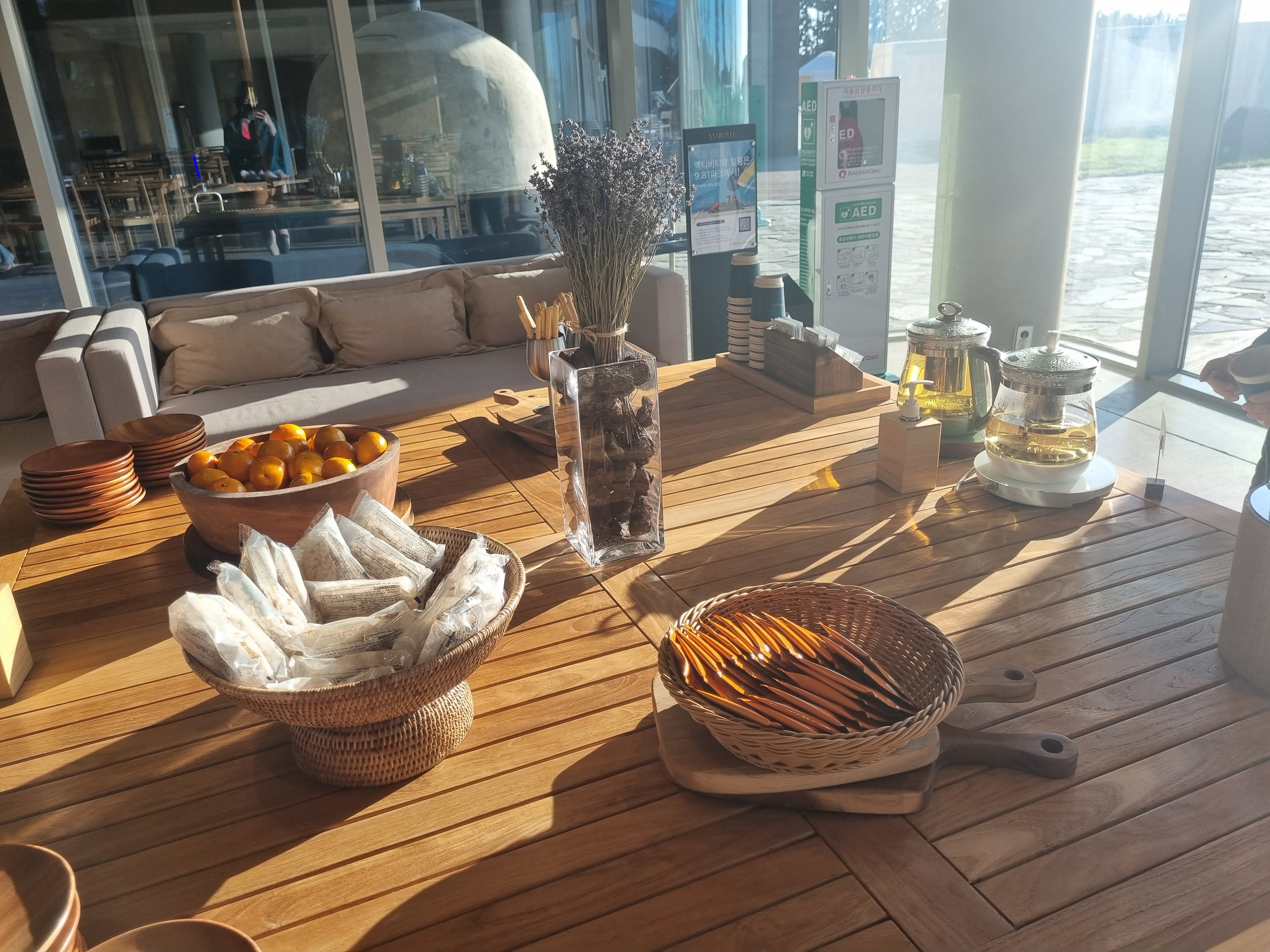 투숙객들은 언제든지 여기 북카페도 이용 가능. 책을 읽을 수 있는 공간 뿐만 아니라 물이랑 각종 식음료들을 판매하는 자판기도 비치되어 있다. 뿐만 아니라 무료로 여러 가지 차와 스낵들도 구비되어 있었다. 여기에 있던 제주 과자 두 가지 맛 보고서 집으로 돌아갈 때 선물용으로 따로 구매했다.