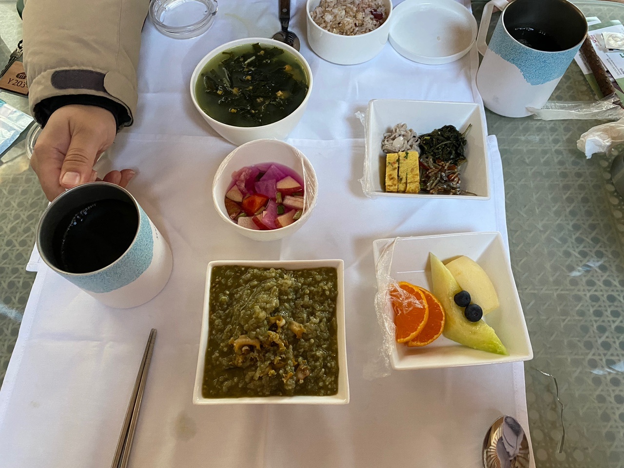 체크인을 하면서 조식을 신청하면 숙소 앞으로 배달이 된다. 원래는 배달하고 세팅을 해주고 가지만 우리는 늦잠을 자느라 문 앞에 우드박스를 숙소 앞에 두고 갔다. 우드박스를 오픈하여 하나하나 꺼내서 숙소 안에서 세팅해놨다. 위 사진에 보이는 게 한국식 전복죽과 한식 성게 미역국이다. 테이블 위에 깔 수 있는 테이블보도 함께 온다. 보온병에 담아온 덕에 바로 차린 것 같이 따뜻하게 먹을 수 있었다. 미역국은 따르다가 한뭉덩이가 한번에 퍽 하고 빠지는 바람에 ㅠ 살짝 엎었다. 후식으로 바로 먹을 수 있는 따뜻한 아메리카노와 과일까지 함께 와준 덕에 카페인 충전까지 완료. 스타빌표 커피 진짜 내 취저인데 숙소에 보면 커피 원액이 있어 그건 아이스로 먹음 된다.