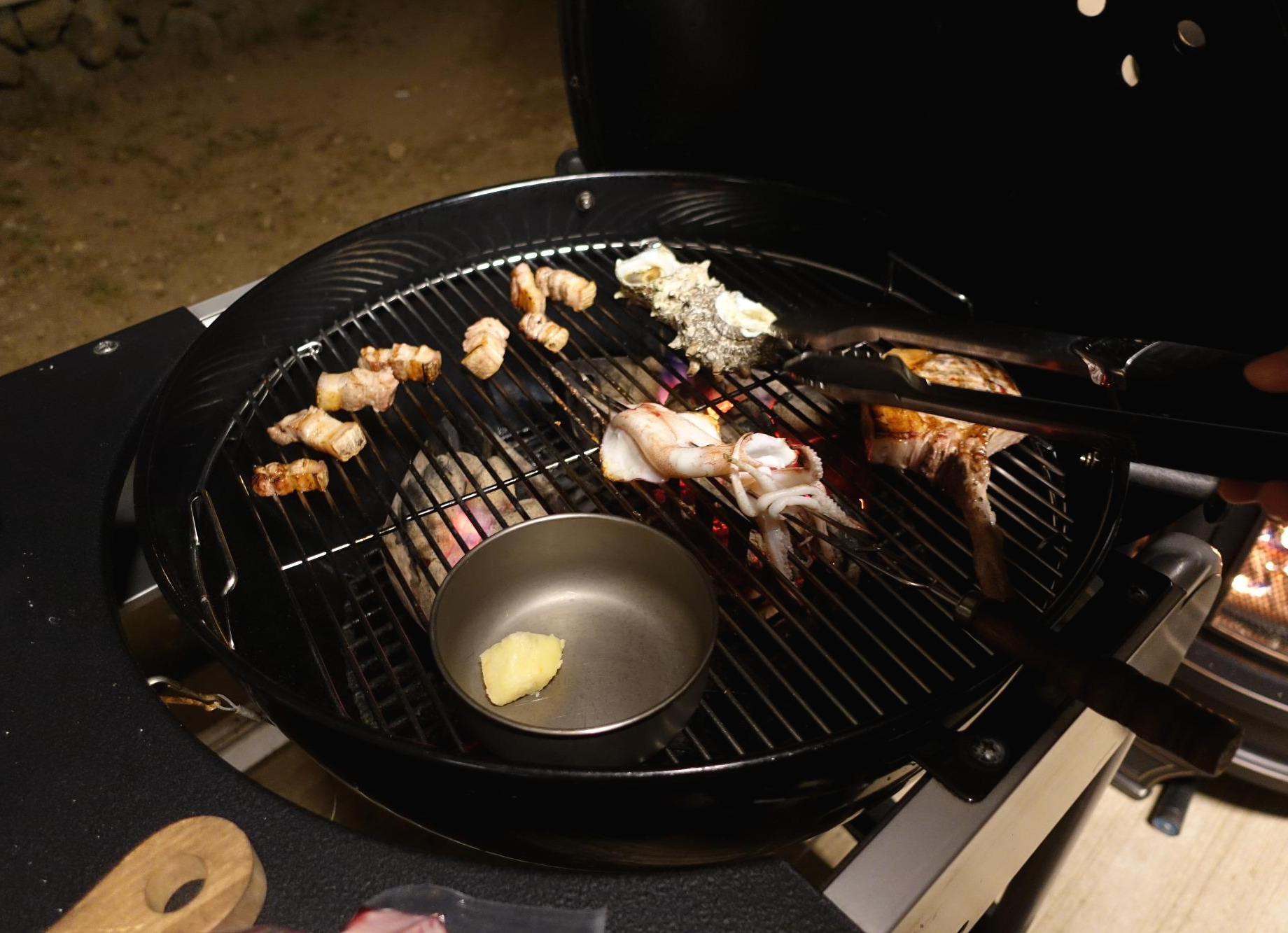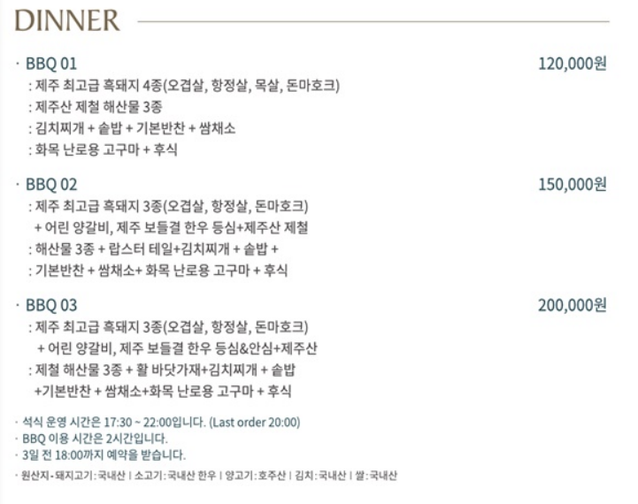 글램핑의 묘미라고 한다면 바베큐가 아닐까. 저녁 한 끼는 스타빌에서 바베큐를 진행했으며 조식과 함께 체크인을 할 때에 예약했다. 오후 5시반에서 8시 사이에 주문을 받으며 두 시간 동안 이용할 수 있다. 석식 운영 시간 내에 시간을 정해 알려주면 불을 붙여주고 음식이 제공된다. 음식이 종류별로 다양한 만큼 양도 어마무시했다. 흑돼지와 양갈비, 거기다가 해산물까지. 해산물의 크기를 보고 놀랐다. 원래도 위가 워낙 작은 탓에 다 먹지 못하고 온 게 아쉬웠다. 고기만 있는 게 아니라 옆에 미니밥통 안에 밥도 가득 차 있는 데다가 나중에 김치찌개까지 나와 더 배불렀다. 아마 3~4인용이지 않을까 싶다.