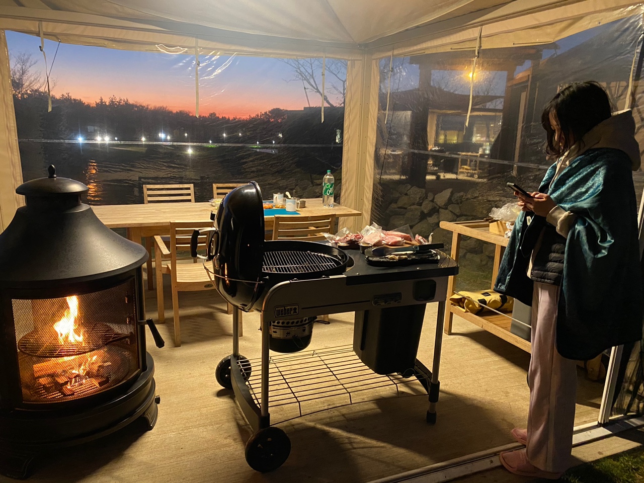 바베큐를 하면서 바라보는 스타빌의 모습은 골든타임에 걸려 굉장히 아름다웠다. 직원분께서 불을 붙인 뒤에 오빠가 직접 구워주었다. 치즈는 전날 먹다가 남은 거 녹여서 랍스타 위에 얹었다. 숙소 안에는 식기류가 없지만 석시에서는 넉넉하게 제공된다. 날이 워낙에 추웠던 관계로 식사를 한 뒤에 화로불 근처에서 떨어지지 않았던 듯 하다. 불이 희미해질 때 쯔음에 다시 요청하면 불을 다시 붙여준다. 식사를 마친 뒤에 화로에 감자를 넣고 대형 마시멜로우 굽기는 오빠한테 배워서 내가 직접 구워봤다. 블루투스 스피커로 음악을 틀고 불멍을 때리니 그야말로 글램핑의 분위기 물씬 느낄 수 있었다. 특히 석식 후에 제공되는 감귤쥬스는 꼭 드셔보시길.