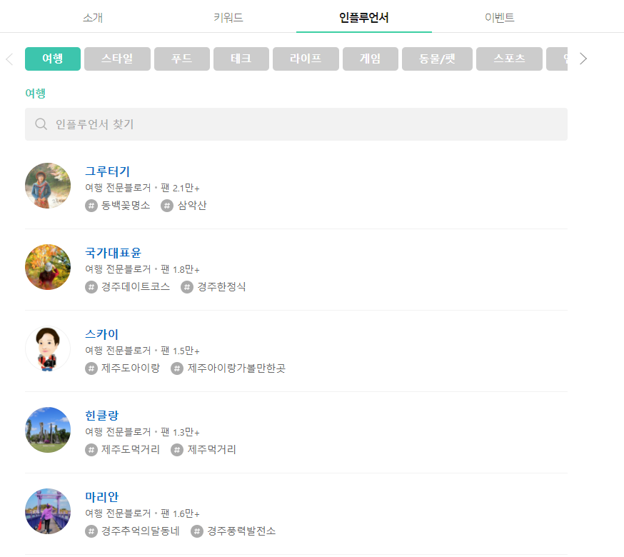 주제를 결정했다면 그 주제에 맞는 인플루언서들을 둘러볼 차례다. 다른 인플루언서들은 어떻게 글을 작성하고 있는지, 어떤 채널을 어떻게 운영을 하는지 등을 둘러보면서 서칭을 해보는 것이다.