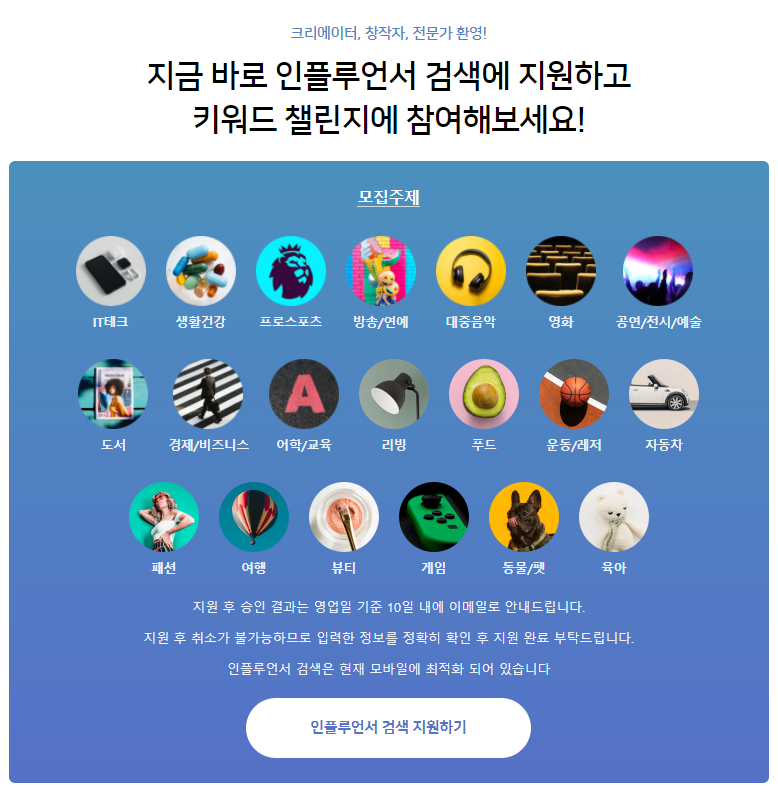 인플루언서에 도전할 수 있는 주제들은 위와 같다. 이 중에서 한 가지 선택을 하고 좀더 전문적으로 키워나간 블로거를 인플루언서로 채택을 하고 있다. 기존에 가지고 있던 블로그에서 내가 작성했던 글들이 어떤게 있는지 살펴보고 그에 맞게 선택하여 관리를 해나가면 될 거 같았다.